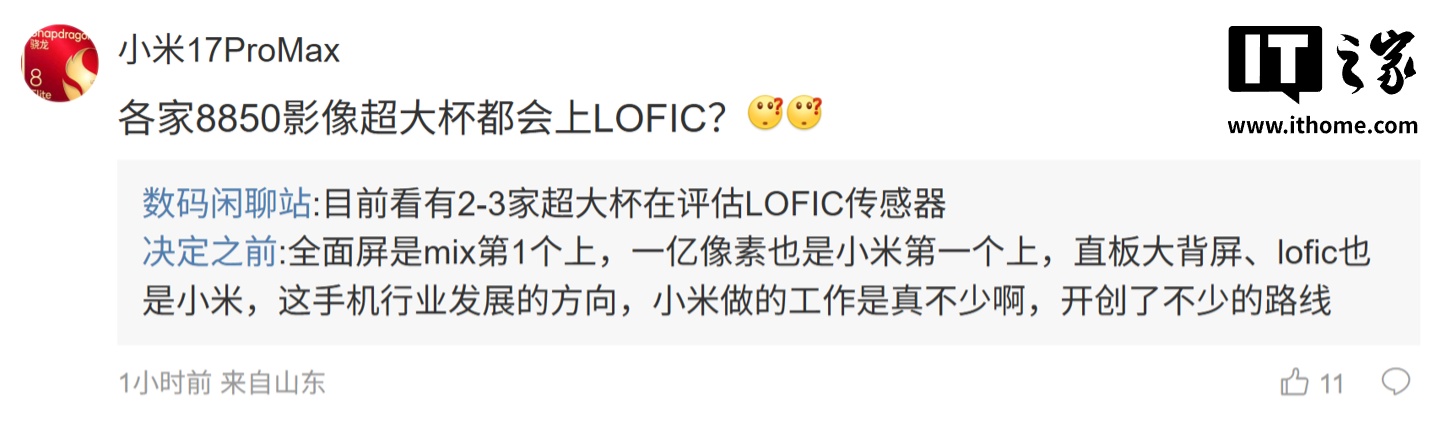后续有用户在评论区询问:“ov50k 哪个算上一代 Lofic?”,博主回复道:“应该算第一代吧,小米 17 Pro 是首发第三代 LOFIC,只是官方没吹”;另一名用户则询问道:“各家 8850 影像超大杯都会上 LOFIC?”,博主则回复道:“目前看有 2-3 家超大杯在评估 LOFIC 传感器”。