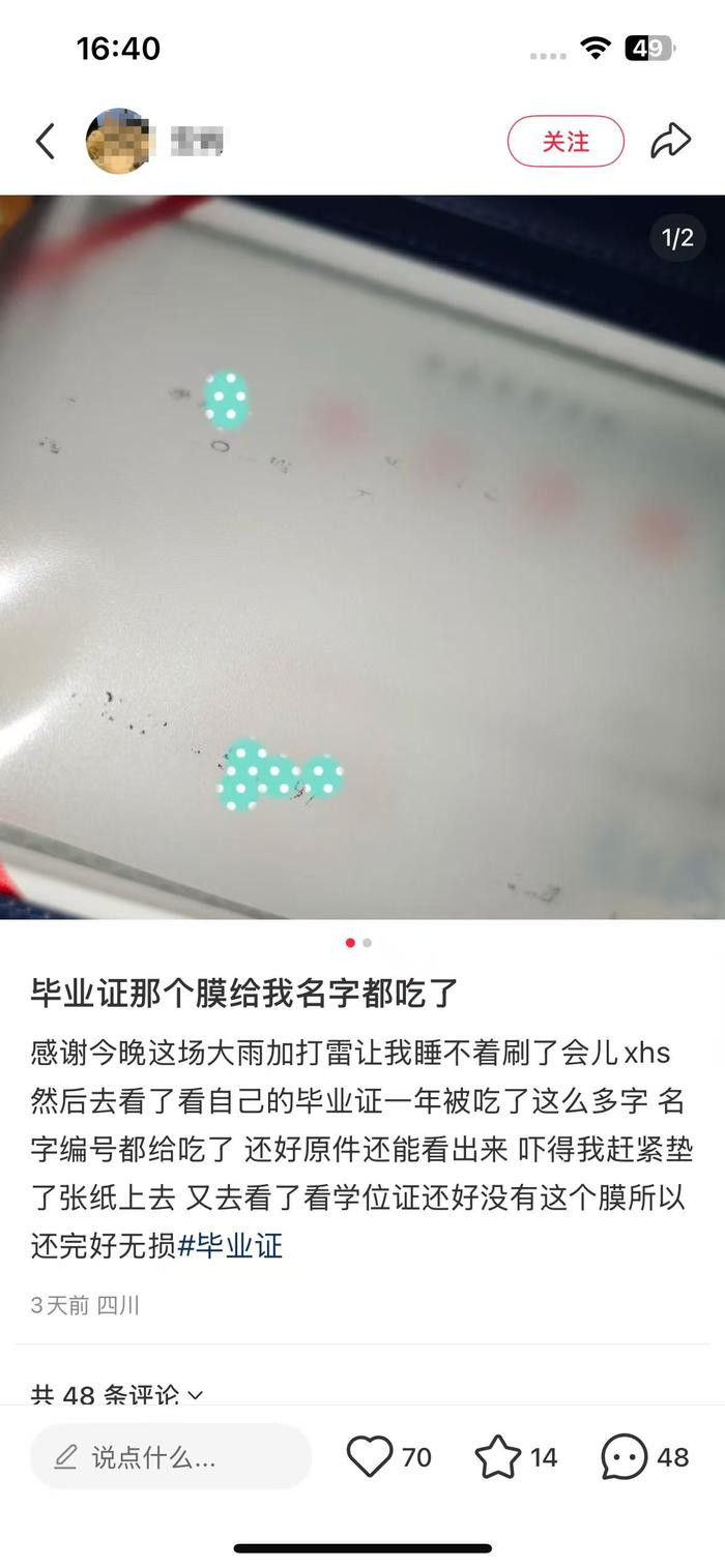 对此,有网友支招:“证件其实很好保存,不要使用证件自带的壳,把内页从壳里拿出来,放到无酸纸档案袋里。也可以买一个档案盒,每张证书有字的一面垫上A4纸,最后在档案盒里放上干燥剂,定期检查。”