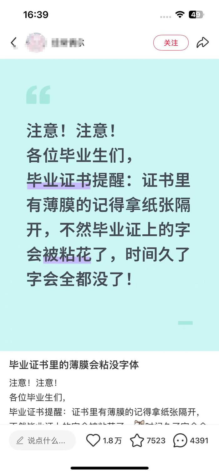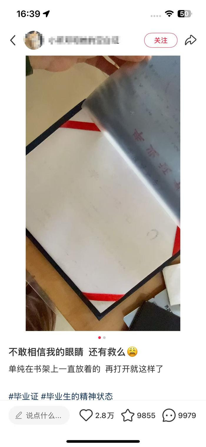 “大家一定要注意,我毕业证上的字被粘掉了,如果这次没发现,时间久了字就全没了。”“快去看看你们的毕业证,我毕业证上的字已经被粘掉了。”近日,不少网友在社交平台发帖称,自己的毕业证变成了“无字天书”——证书上的字体被证书自带的塑料膜粘掉了。